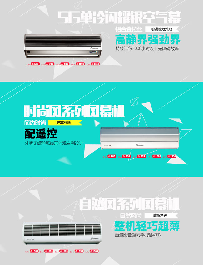 S5、時(shí)尚風(fēng)、5G等系列風(fēng)幕機(jī),鋁合金外殼永不生銹,堅(jiān)固不變形,外觀時(shí)尚。天花機(jī)可嵌入天花板,適用無(wú)法側(cè)裝的高檔玻璃門等特殊環(huán)境??钍截S富,系列齊全,適應(yīng)各種使用環(huán)境。