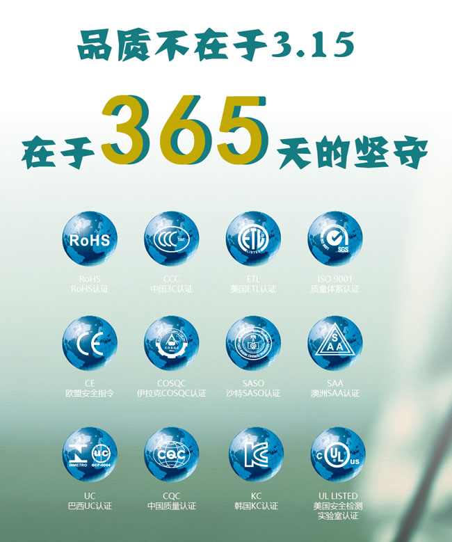 產(chǎn)品已通過(guò)ISO9001質(zhì)量認(rèn)證、ISO14001環(huán)境認(rèn)證、國(guó)家CCC、歐共體CE、ROHS、澳洲OC認(rèn)證和美國(guó)MET(UL)等多項(xiàng)國(guó)內(nèi)外認(rèn)證,遠(yuǎn)銷80多個(gè)國(guó)家和地區(qū)。