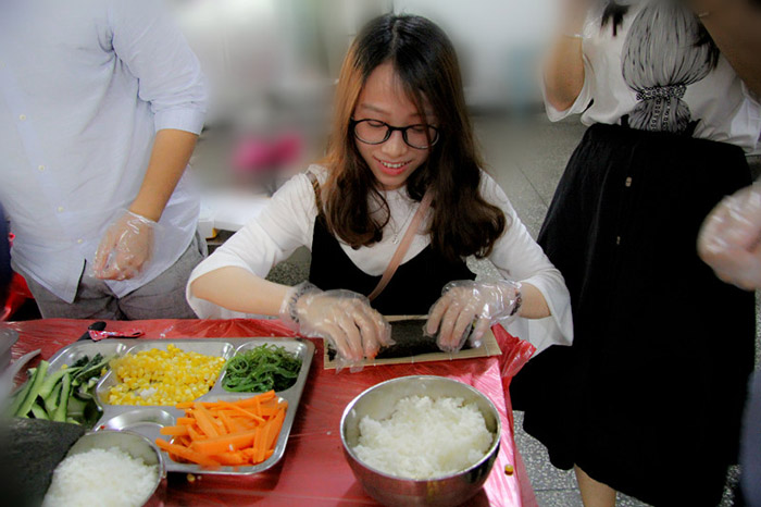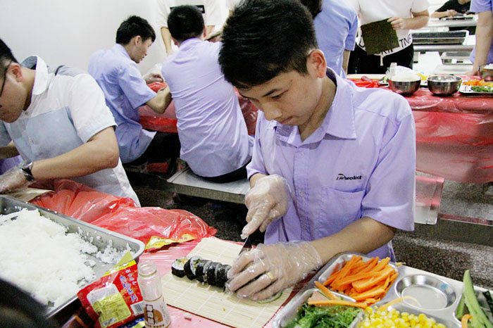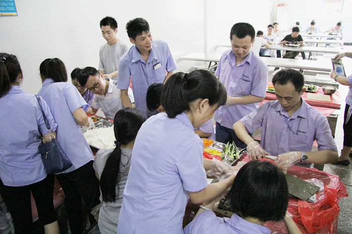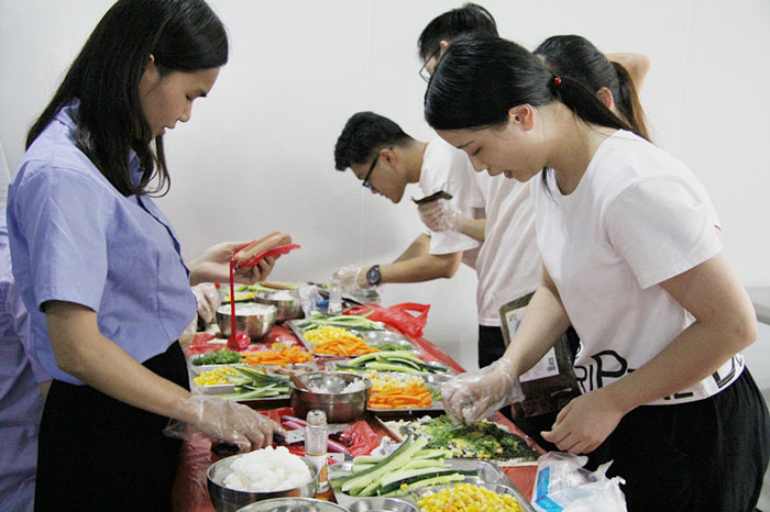 當(dāng)天17:00,小吃貨們翹首期盼的時(shí)刻終于來(lái)了。大家分工合作,帶上手套切食材,將材料按組分配。