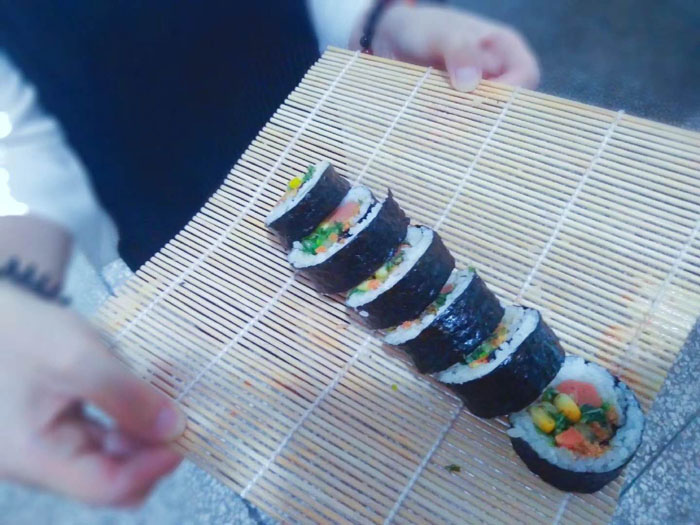 花姐“現(xiàn)場(chǎng)授課”,多才多藝的她對(duì)做壽司頗有心得,一邊講解一邊示范。