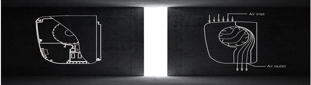 采用新型風(fēng)道設(shè)計(jì),風(fēng)輪與彎板和曲板以最小距離設(shè)計(jì)形式,使整機(jī)噪音降低。